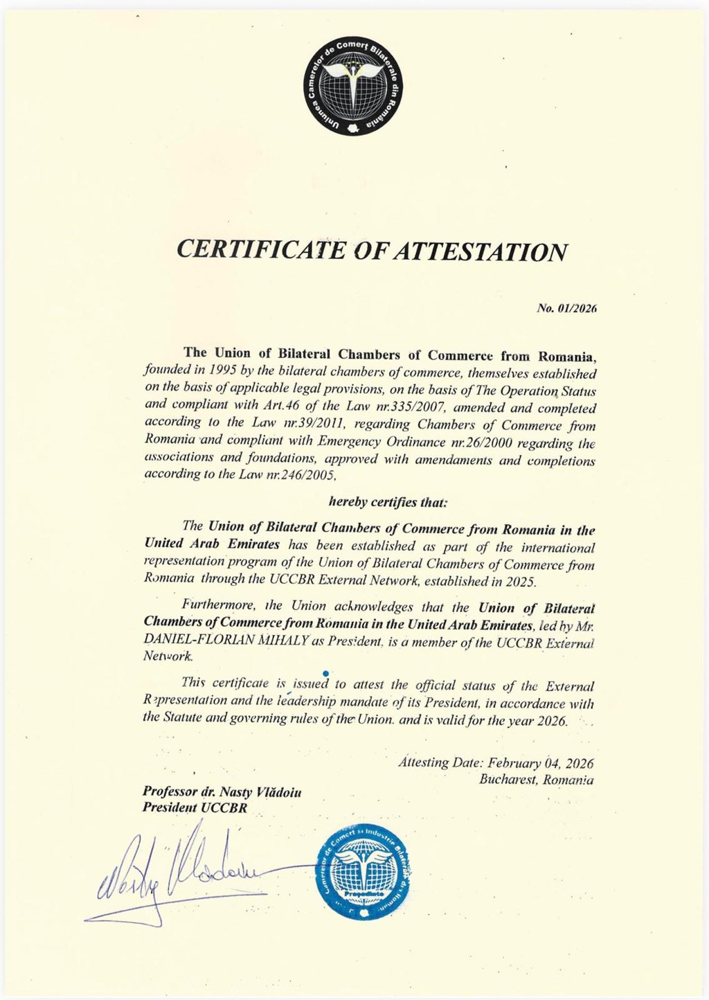 The business club is named “External Network of the Union of Bilateral Chambers of Commerce Romania – United Arab Emirates”, hereinafter referred to as the “Club”.